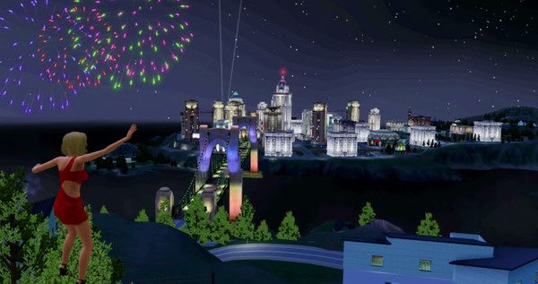 Celebrity sim jumping, looking at city.