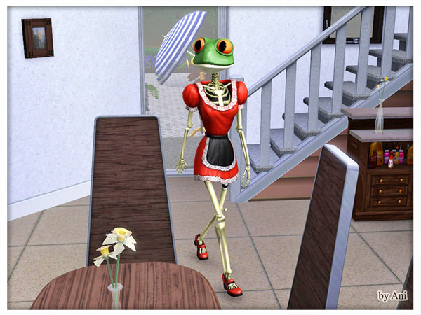 This is Bonehilda the skelet maid of my sims. But someone of the witch sims had used a frog curse spell on her, so then she got a frog head. After some days having passed, however, she retrieved her ordinary appearance as the spell time has expired.