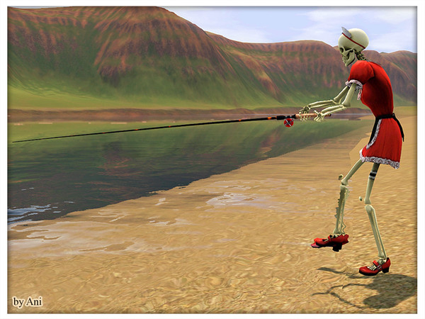 Here is Bonehilda the skeleton maid from my sims household (I have used some cheats so I get her playable), she is just fishing at the waterside, it's in Appaloosa Plains. At the end of her attempts, she finished by catching a small minnow, but not any big fish.