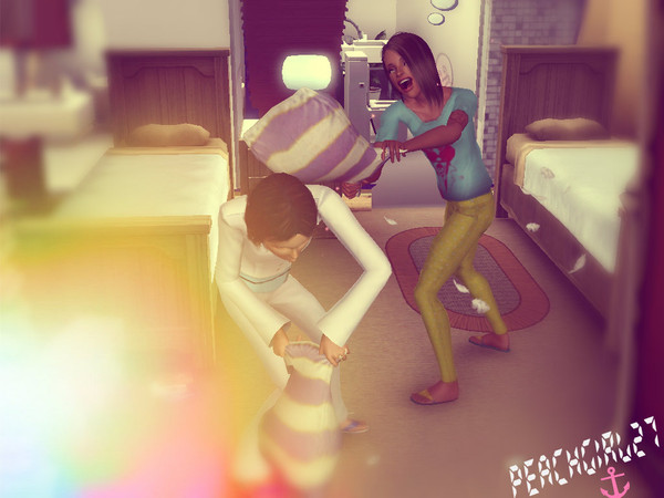 Hehe.. Clever title, eh? Or even "Like Mother, Like Daughter".. Eh, not as funny. Anyway here's my self-sim pillow fighting with her daughter Cara. Aw, how sweet. EDIT: Er, my bad, it says "PeachGirl27" b/c that's my MTS username lol..