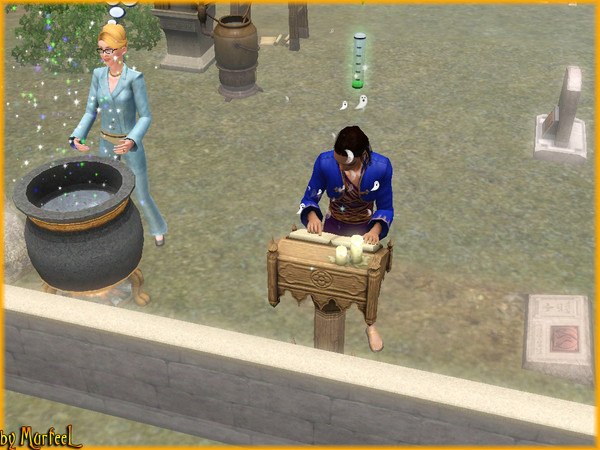 My sim was busy learning spells when this woman came out of nowhere and started sniffing around him before using the cauldron...that I was going to Enchant in a few seconds, woman! She wouldn't leave him alone!