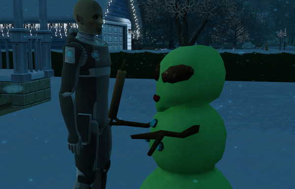 My Alien decided to make a snowalien instead of a snowman. The snowalien sure looks like it's ready to put up a fight with the bowling pin though, doesn't it?