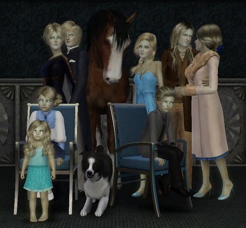 My vampire family in 3 generations :) At the far right we have the eldest vampires, Eddard and Victoire Darenhowe, at the left we have their son, Mormont and his wife Elizabetha and their teenage daughter Toria, twin son and daughter Eddard Jnr. and Luciana and last and not least little Claudia. and their pet horse and loyal dog.
