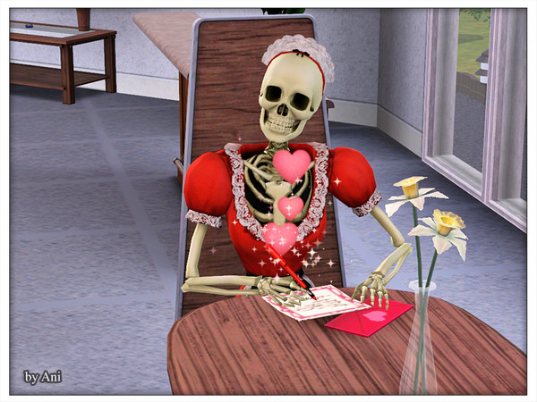 Bonehilda is here writing a love letter to a sim guy, that she fall in love with. After having sent the letter, she just received a letter with a negative response in it, and here also discovered that this sim was married, so at the end, poor skeleton maid was very disappointed.