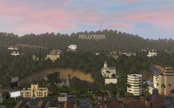Hollywood at sunset. Chateau Marmont, Capitol Records Building and LaBrea Tar Pits in the foreground.