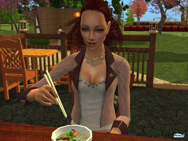 My sim, Helen, Enjoying some asian seafood on vacation.