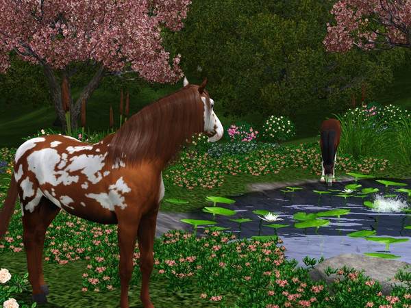 A lone stallion looked across the pond to see a lovely mare enjoying a cool drink on a sunny day.
