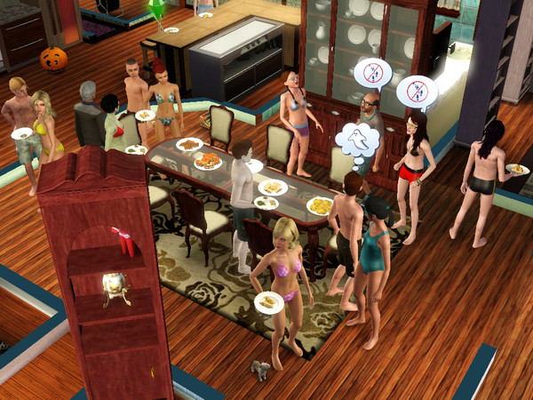 My teen sim and her sister wanted to throw a party the sim in the pink bikini and the one in in the yellow are my twin sim girls.