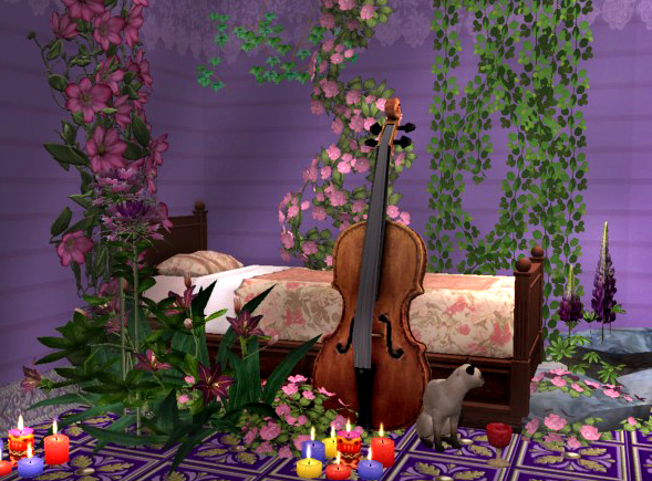 A fantasy bedroom with beautiful flowers crawling on the wall and a cat watching on you :)
