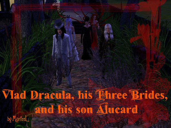 This is my favorite vampire family: Vlad Dracula Tepes III is the vampire Gary Oldman played in the movie Bram Stoker's Dracula. I think he looks HOT. Then there's the blonde, Alucard, Dracula's son, from the Castlevania games. He was the hardest one to dress! :P In the rear are the Three Brides of Dracula. The White Bride is Carmilla (the 1872 horror novel Carmilla actually predates Bram Stoker's novel Dracula). The Black Bride is Wilhemina Murray (better known as Mina Harker), and the Red Bride is Lucy Westenra. How did I do? Please don't comment on this one.