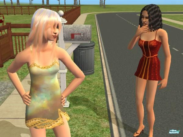 Here's Opal, looking better than she ever did when I was trying to get screenshots to model that dress for submission. (I didn't do her hair, I just like it. But i did the recolor for the red dress on the background sim.) Both of their expressions are pretty good.
