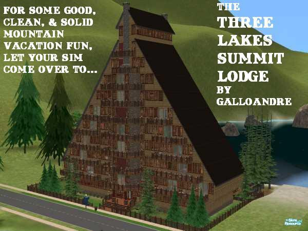 ...When they saw the apparent successes of the Twikkii Tower Hotel and the Takemizu Terrace Hotel, the denizens of Three Lakes decided that they too needed to build a hotel tower of their own (or at least to keep competing for the tourism simoleans), a building that would fit in with the natural beauty of their mountain vacation region. After consulting with their architects and engineers, they came up with a unique and stunning design that represented a house on the summit of a mountaintop. Hence the name: The Three Lakes Summit Lodge.