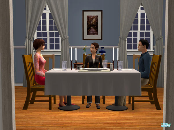 The famous dinner scene from the movie American Beauty where Lester throws a plate of asparagus at the wall. These sims like to eat invisible food :)