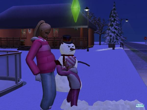 They had just finished building the snowman and the daughter turned to pat her baby sister/brother.
