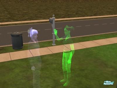 Right of the picture - Skye Cage died suddenly and tragically of an unknown disease. This disease resulted in Skye's ghost being green. Left of the picture - Elise Cage starved herself to death, after the death of her partner Skye Cage. Elise's starvation resulted in a blue tone to her ghost.
