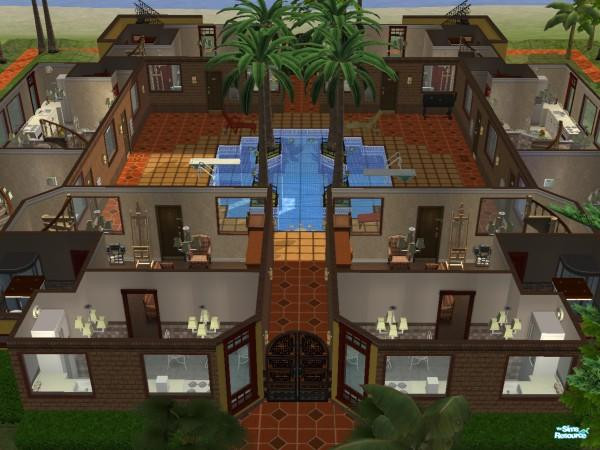 Here is a screen shot of my newest apartment lot, The Santiago Condominiums. This particular shot shows the general layout of the first floor and the pool/courtyard area.