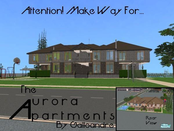 ...My newest Apartment Life lot arrives to TSR! Introducing the Aurora Apartments! Here's the exterior. No CC, and hack-free. Notice also there's no driveways. See, since these apartments are (generally) supposed to be in the city, why in the world should a Sim drive around in their own vehicle? ;D
