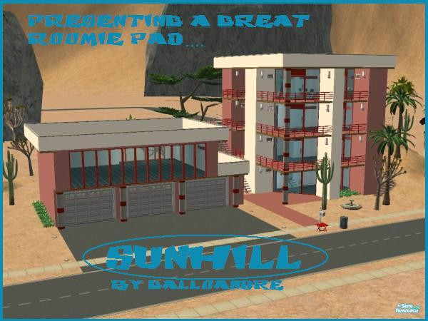 ...My newest lot, Sunhill! Here's the exterior. Introducing an exciting, desert-themed three-roomie pad for your Sims (or for a small family if you'd prefer)! The home is built right into a hill. Huge empty space above garage for your use. This home is unfurnished, save for the fourth-floor kitchen and the bathrooms. Hack-free and no CC.