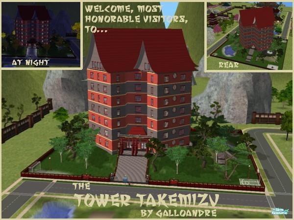 ...My newest lot, the Tower Takemizu! With its pagoda roofs,this remarkably-designed hotel really stands out in the Takemizu Village! Swim, fish, dine, play basketball or soccer (football), and even roller skate, along with a sauna,and mahjong,among other activities! Caution: This lot could be too much for some computers. It could make a great landmark in your Neighborhood View, though. No CC. Hack-free.