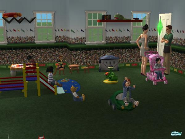 Just a mom talking to a daycare worker before she drops off her kid. Other kids playing in the backround.