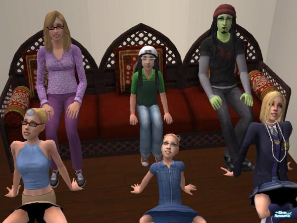 My sim family. The sim me is on the top left, then it goes Bo, the youngest, then the father Augustus, as you can see none of them share his skin tone, then the bottum we have Joy, then the youngest girl Mae, then Joy's twin Night. Oh and as you can see I have another on the way!