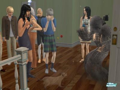 Grim uses a mouse to lead Damsak to the "other side" while the family looks on.