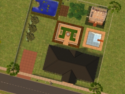The yard for my Sim is not very fancy. It has a sitting/shrubbery area in it with two benches and a fountain. There is a small garden patch beside the pond. I've also built a garden house for my Sim to exercise and/or relax in when she's not in the pool.