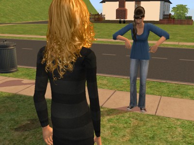Seraphine (sim in black shirt) isn't welcome around her daughter's adoptive home. Gloriann shoos Seraphine off the property.