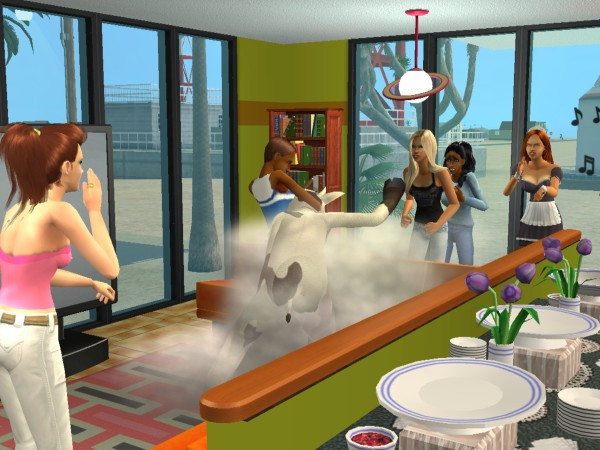 These college Sims whoop it up (at least some of them do) as a cheerleader and the cow mascot go at it. From a new lot I'm testing to be released soon at TSR.