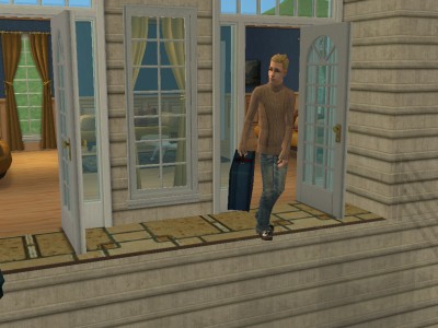 The stairs beneath him just faded while in zoomed in on him, but it looks like he's about walk off a steep ledge!