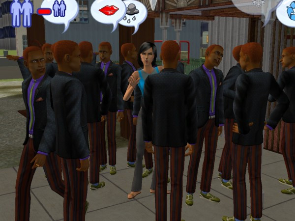 "Some visitors have come to welcome you to the neighborhood" or at least that is what the little bubble said....what it should have said is.."A visitor cloned 21 times has come to welcome you to the neighborhood".....I think this was the FUNNIEST glitch I have had in my game. The look on her face says it all....