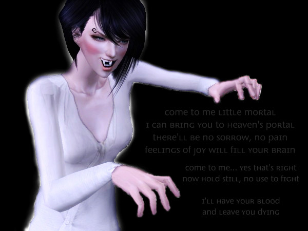 Come to me, little mortal I can bring you to heaven's portal There'll be no sorrow, no pain Feelings of joy will fill your brain Come to me... yes, that's right Now hold still, it's no good to fight I'll take your blood, and leave you dying Didn't you realize I could be lying?
