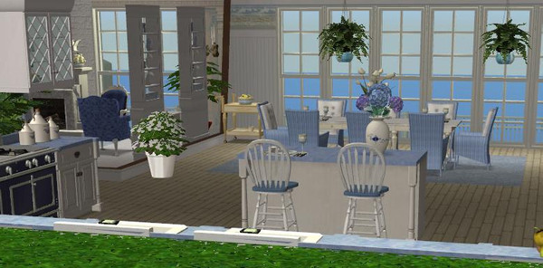 Overlooking the ocean, a small two bedroom bungalow with an open floor plan. This is the kitchen and dining area. Thanks go to all the wonderful artists here at TSR!