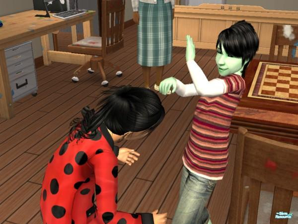 Two of my in-game born sim-kids, Mercury Alanis (obviously the green-skinned one) and Sara Litwin. I was trying to get them to hug, but Mercury doesn't seem to be that much of a people-person.