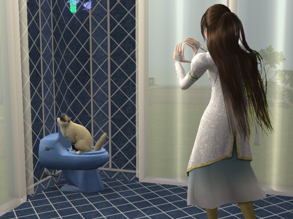 Playing my witch sim I decided I had to have some cats (spectral cats not being enough :) so I adopted Isis, and was teaching her to use the toliet....then this happened! It's what happens when an artsy person owns a cat I guess...poor Isis!