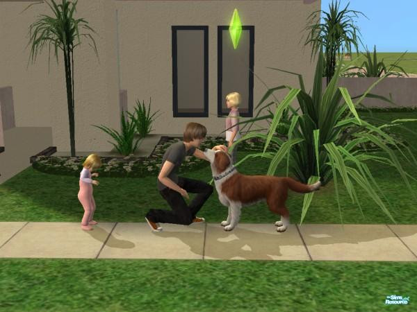 My teen sim, Dredrick Worthington pats his brown Border Collie Dolly while his two younger sisters play in the front lawn of their new house.