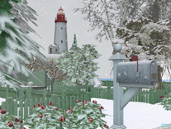 We're about to endure another mid-July heat wave here in beautiful upstate New York, so it's refreshing to cool off with a nice snowy Sims winter's day. Here's a shot of my "Lovey Dovey's Summer Place" lot, looking out toward the sea. Brrrr!!!!