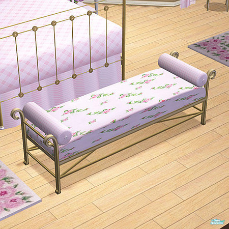 A cushioned bench for the bedroom. The bench is linked to Maxis's bedding and will use most of your in game custom bedding. The metal frame is available in gold and silver tone.