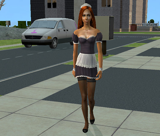 The Sims 2 maid. I've always loved the Maxis French maids, from Sims 1 onwards. Very cute costumes. As you can see, the Sims 2 maid is even cuter following replacement of the default skintones with custom versions - something I wish I'd thought to try a long time ago! Along with replacing the default eyes, this has really improved the look of the Sims created by the game, at least in my opinion. (Might be just me, but I also think her van is very cute!)