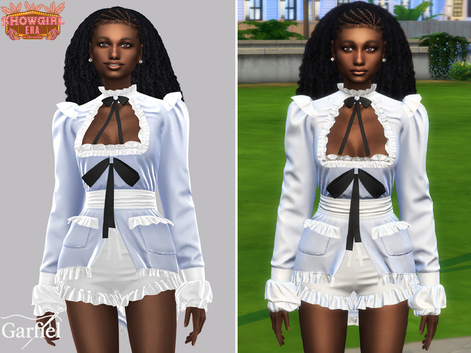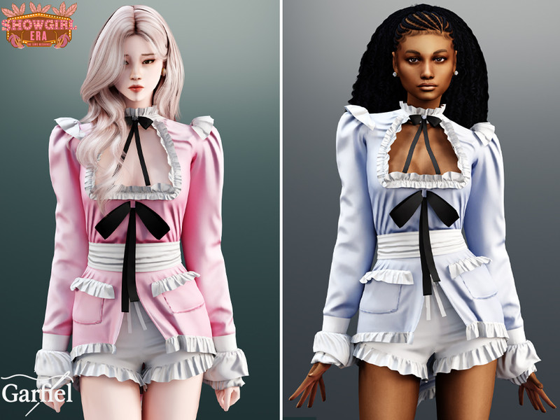 A glamorous adult outfit inspired by vintage showgirl aesthetics, featuring a long-sleeved ruffled blouse with an open neckline, accented by a bold ribbon bow. The look is completed with high-waisted shorts trimmed in ruffles and decorative pocket flaps, capturing both elegance and playful extravagance. Available in pastel tones, this set channels the theatrical charm of classic stage costumes while remaining stylish and wearable for modern fashion themes.