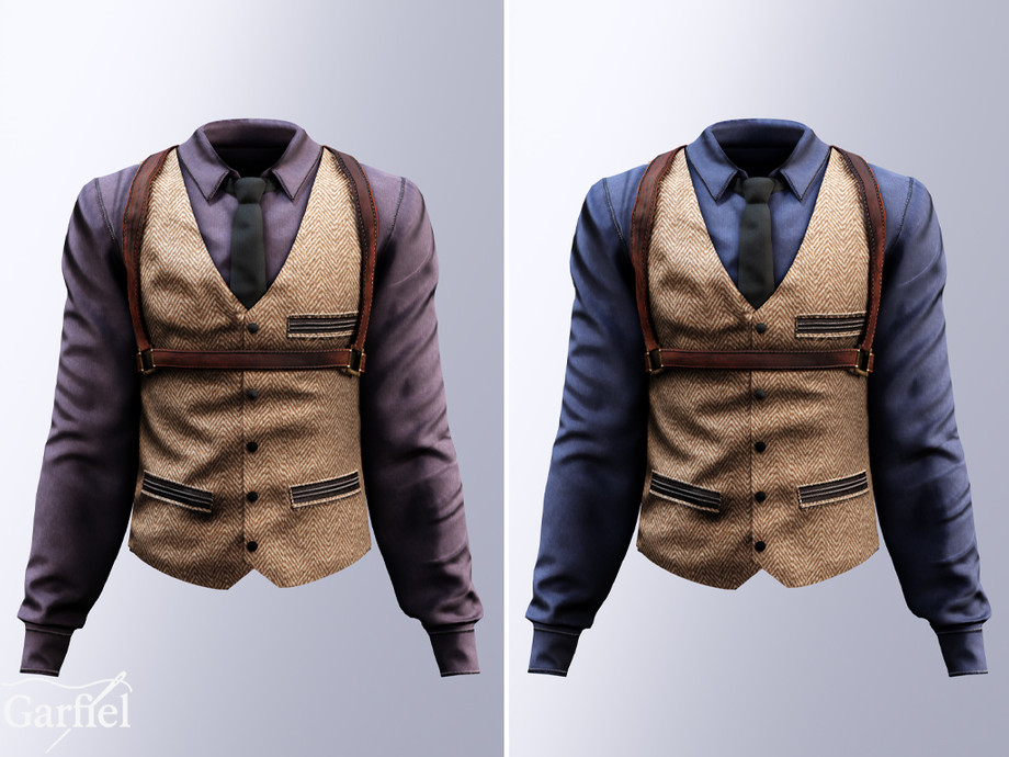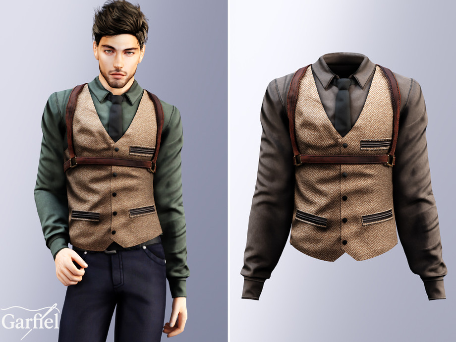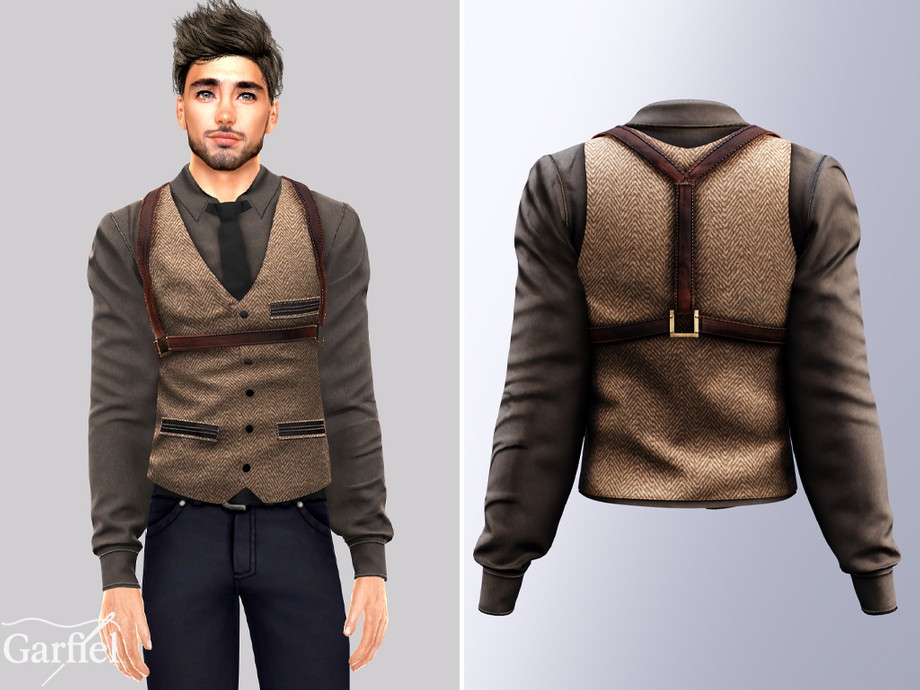 A refined outfit featuring a brown herringbone tweed vest layered over a dark dress shirt, accented with leather harness straps for a bold, vintage-inspired edge. The design blends classic tailoring with modern attitude, detailed with contrasting pockets and metal hardware. Perfect for formal looks, themed events, or stylish streetwear that channels a Peaky Blinders inspired aesthetic. Crafted for sophistication, confidence, and timeless masculine charm