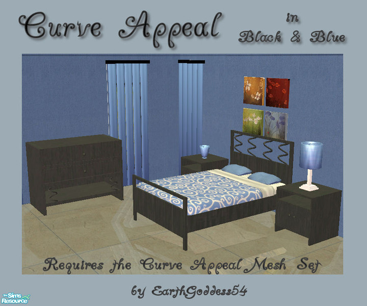A black & blue recolor set of my Curve Appeal meshes; you will need the mesh set for these to work in your game. Base game compatible. *Note: you will need the Spunky Retro Blinds mesh for the blinds!* Set includes: bed, dresser, end table, lamp, blinds, bedding, vase, and painting. Enjoy!