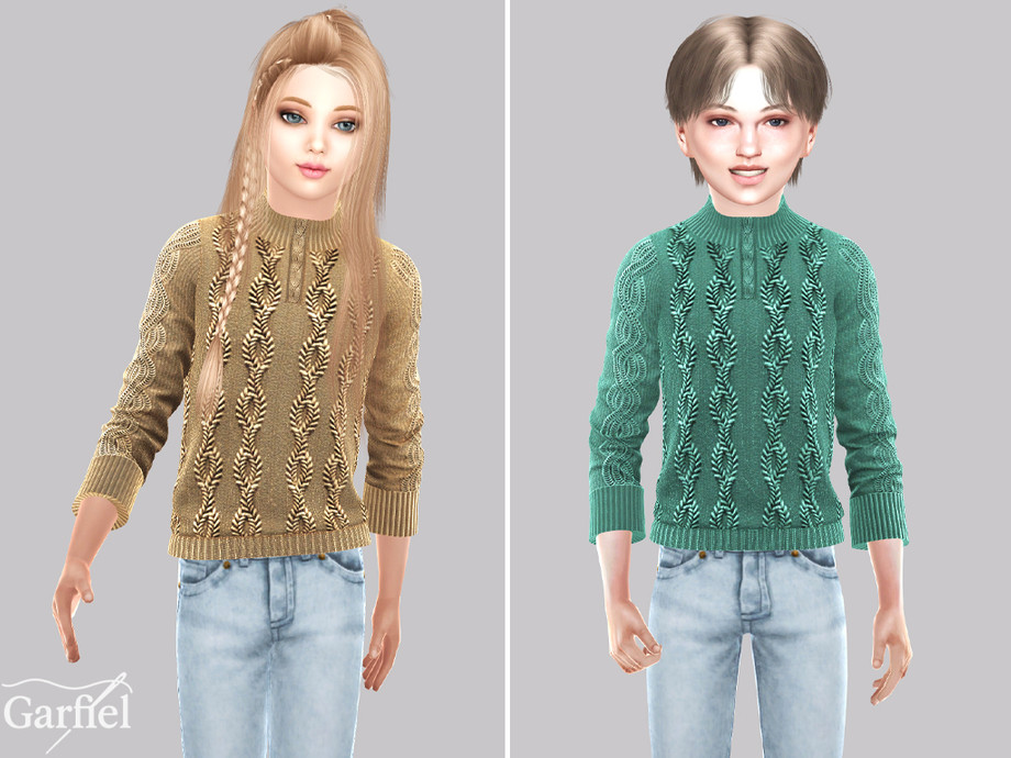 A warm child sized sweater featuring an expressive raised cable pattern running along the front and sleeves. The small half zip detail at the neckline adds a clean, structured touch while keeping the overall look cozy and practical. Comfortable, stylish, and full of texture, this piece is perfect for cooler seasons, school inspired outfits, or any scene where a classic but character rich sweater fits naturally