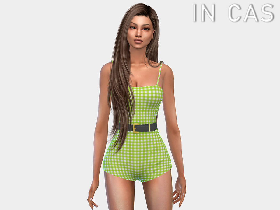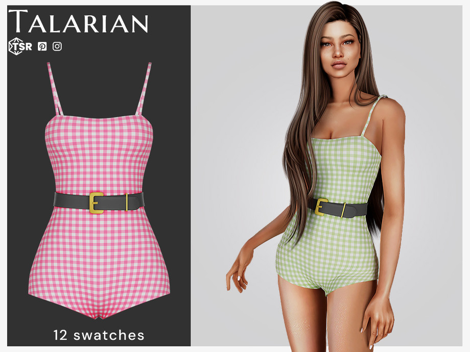 Stylish sleeveless romper featuring a classic gingham pattern, thin shoulder straps, and a cinched waist with a bold buckle belt. The flattering cut and playful fabric make it a perfect choice for casual summer days