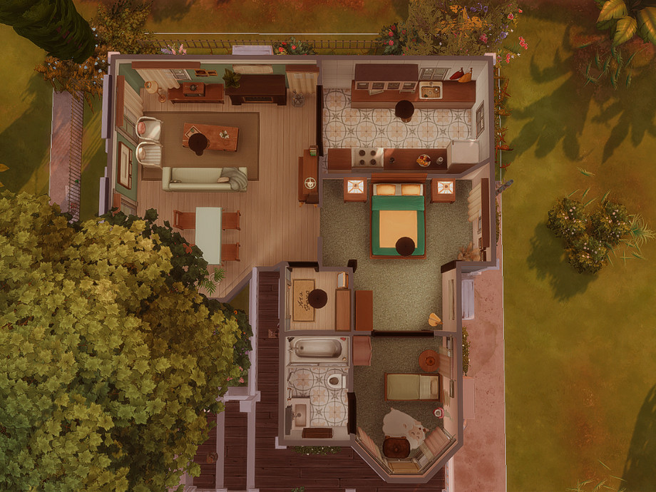 - Compact one-story layout with warm, vintage-inspired interiors.
