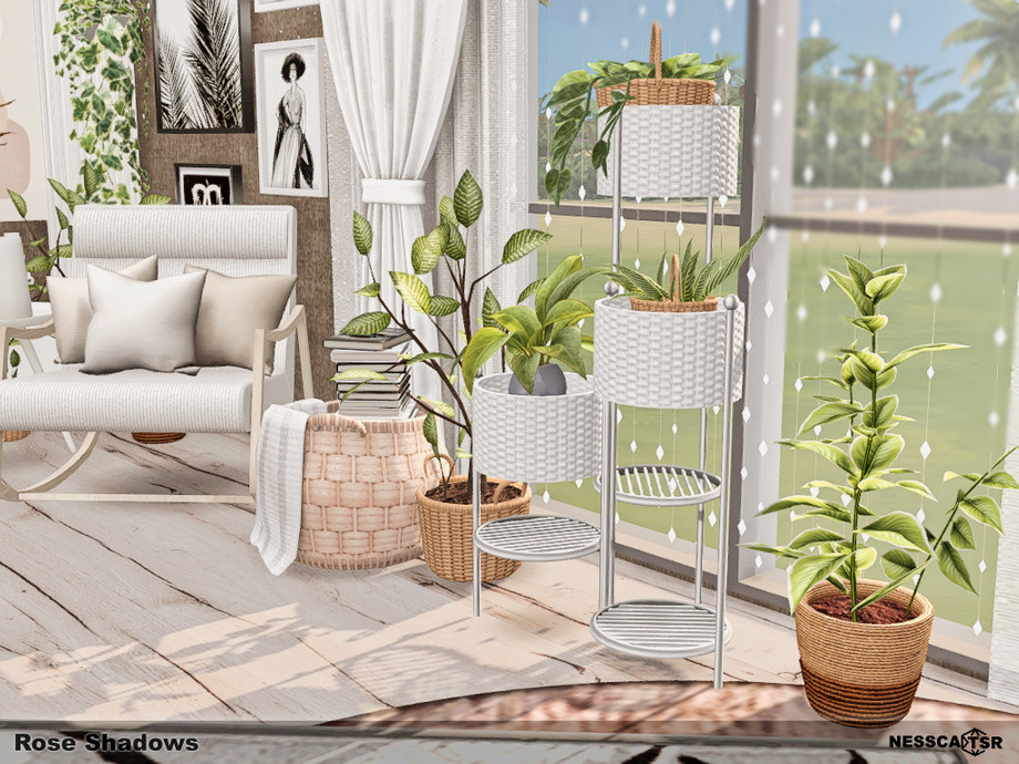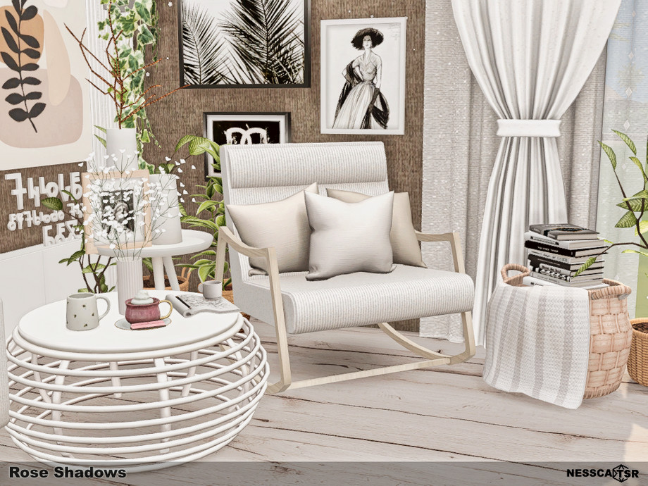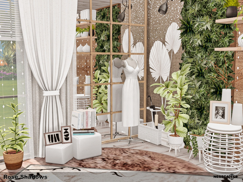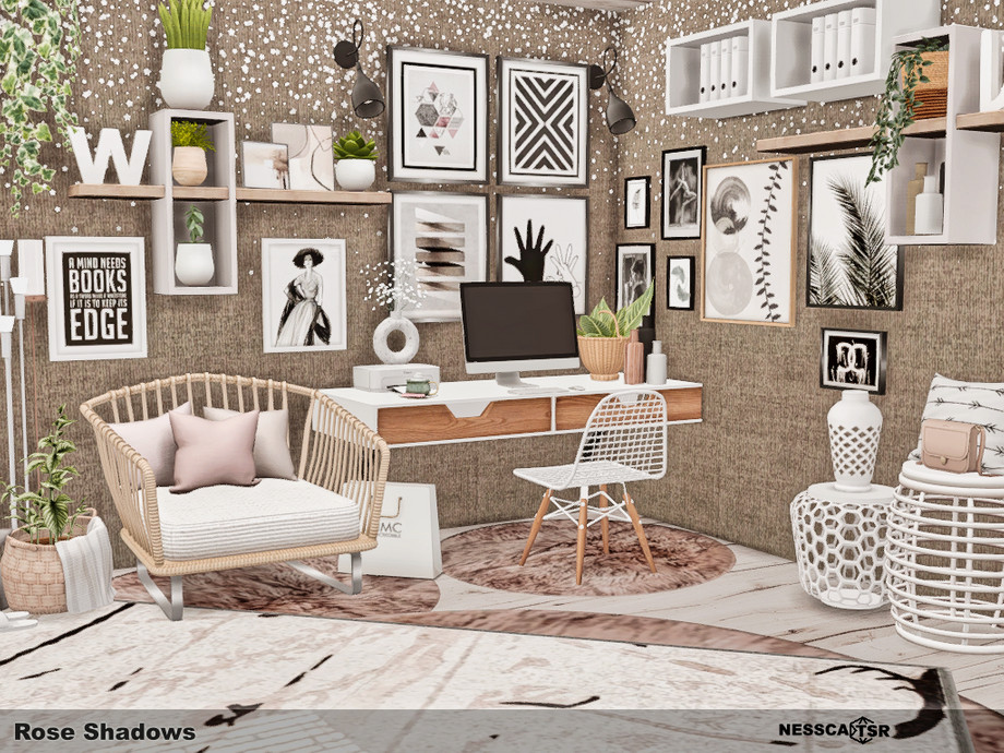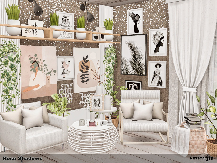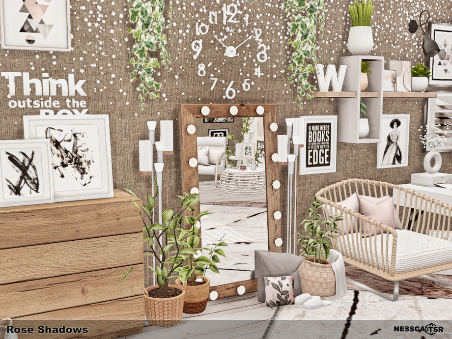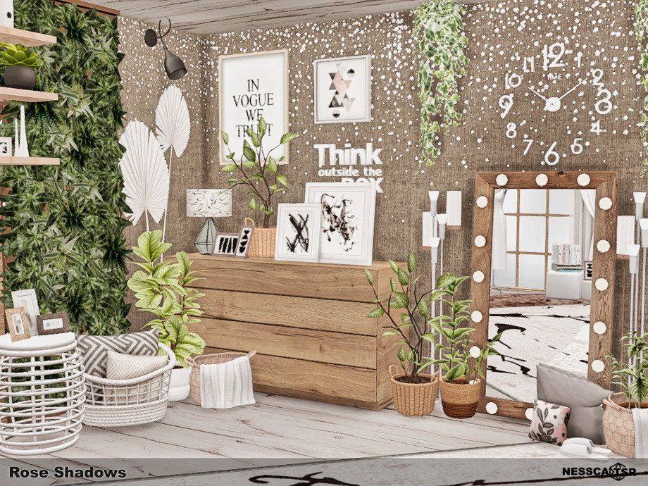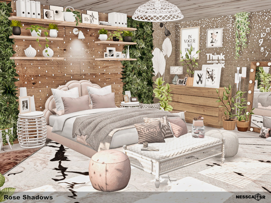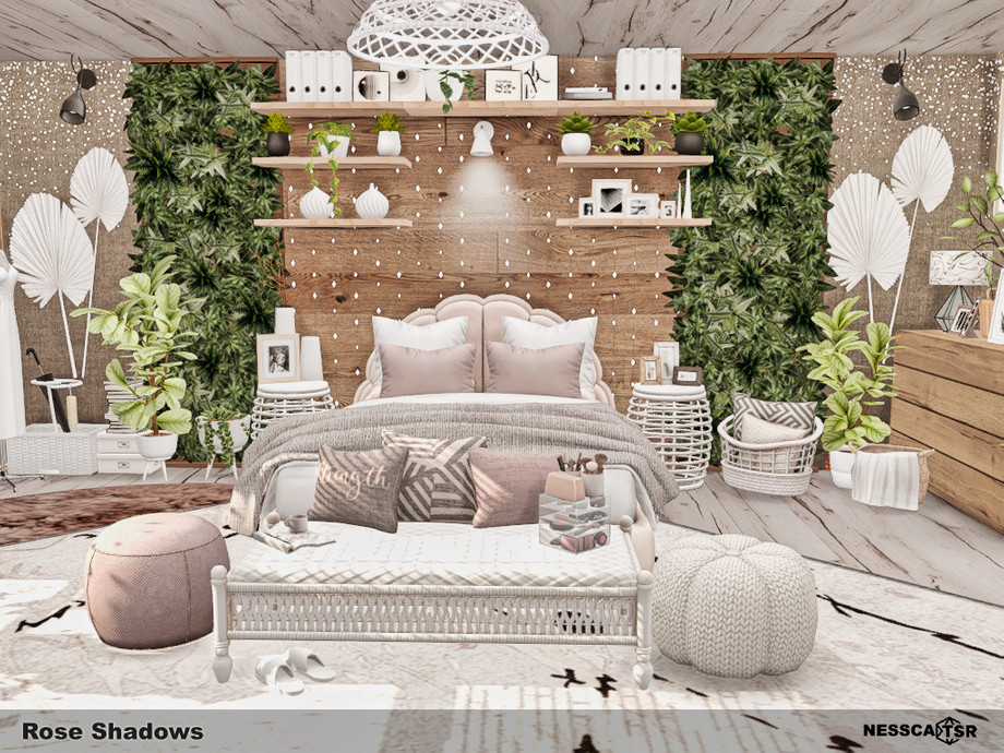 Rose Shadows is a serene boho-chic bedroom with soft blush and neutral tones, abundant lush greenery, cozy textures, and elegant modern details creating a calm, feminine sanctuary. Enjoy!