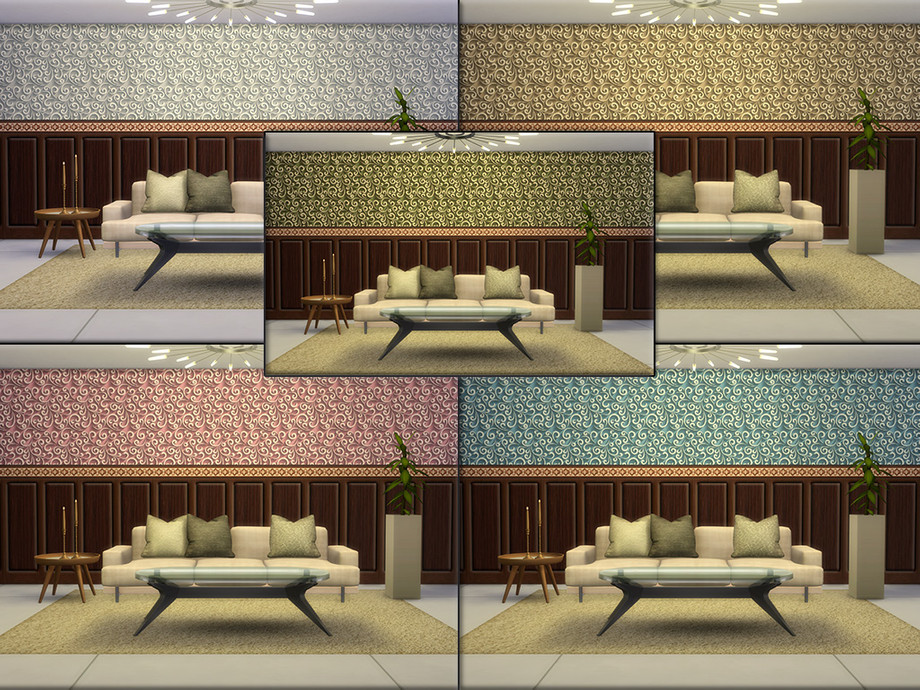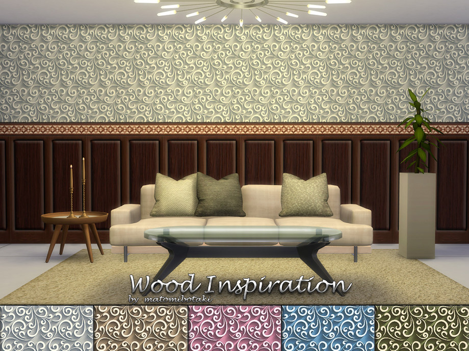Elegant wooden wall paneling with central decorative strip and relief-like embossed wallpaper in the upper part in 5 different color shades and 3 wall heights , each item with custom thumbnail, created for Sims 4 by matomibotaki.