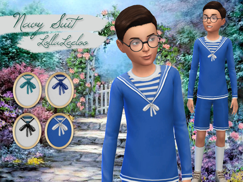 Edwardian Sims need their stylish outfits too, no? So today I bring you a fashionable navy suit for your little Sims gents. It comes in four trendy colors (white, black navy and royal blue) with a bow and cool navy stripes. This is the bottom part of the suit.