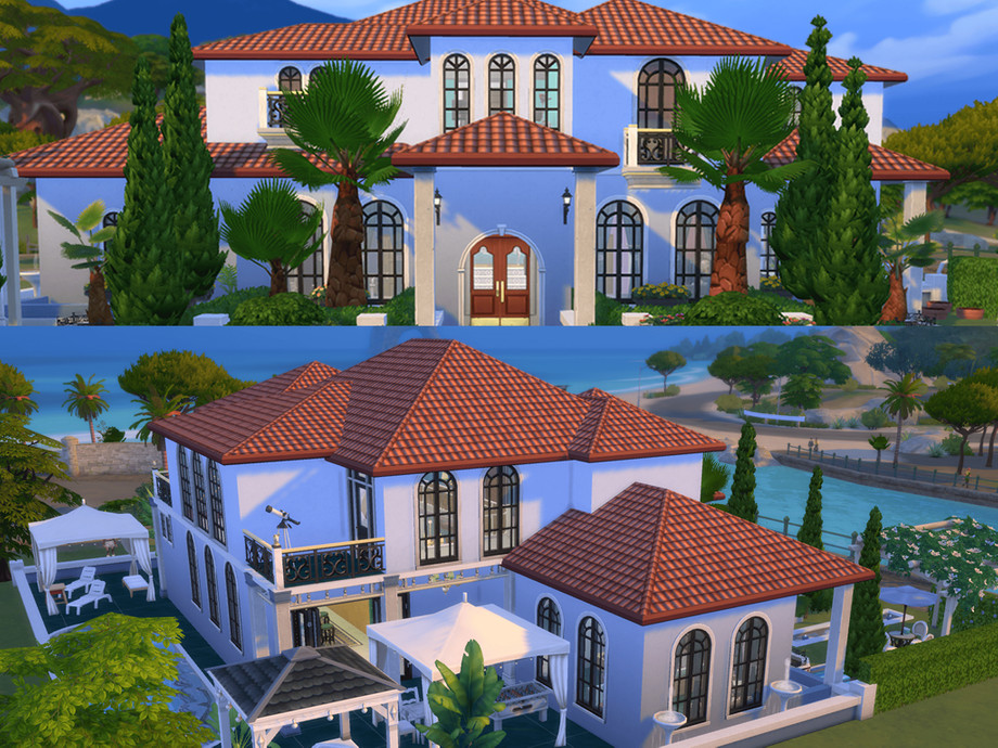 This Mediterranean Revival house blends timeless elegance with Southern European charm. Its terracotta-tiled roof and light blue-painted stucco walls frame arched windows with wrought-iron accents. A spacious front terrace leads to a lush courtyard adorned with palm trees and a small fountain. Inside, rustic wooden beams, patterned tile floors, and warm tones create a cozy yet sophisticated ambiance, infused with French Country and Farmhouse elements. Perfect for sunny climates, this home radiates serene beauty.